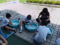 6年生が家庭科の実習で、大きなタライを囲んで洗濯をしていました。電気洗濯機が無い時代の先人や、毎日家庭での洗濯の大変さを実感できたでしょうか?